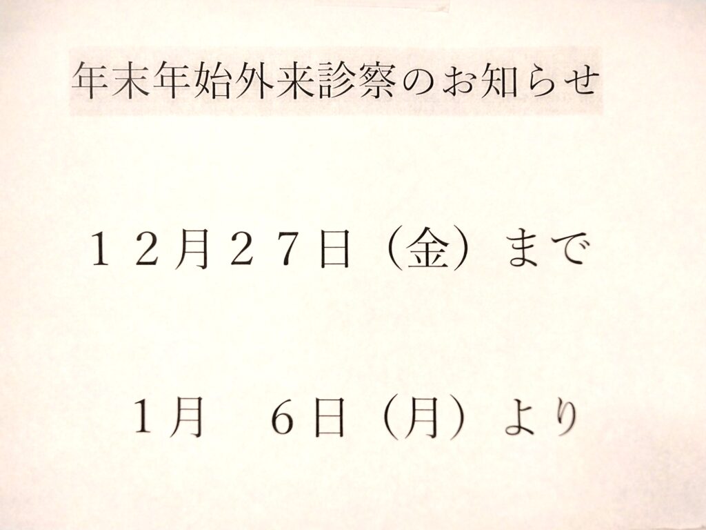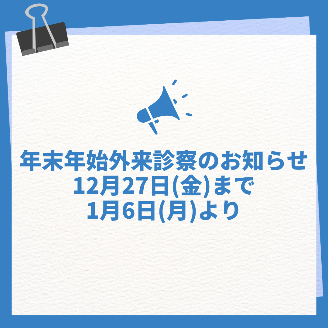 年末年始の外来診療についてのお知らせ文字の大きさ変更 あ Decrease font size. あ Reset font size. あ Increase font size. 医療従事者 2024.11.222025.07.23年末年始は下記外来診療はお休みとなります。ご迷惑をおかけしますが、何卒ご理解頂きますようお願い申し上げます。休診日:12月28日(土)〜1月5日(日)※診察は2024年12月27日(金)まで、1月6日(月)から通常通り診療いたします。\ 最新情報をチェック /FacebookXBlueskyHatenaCopy